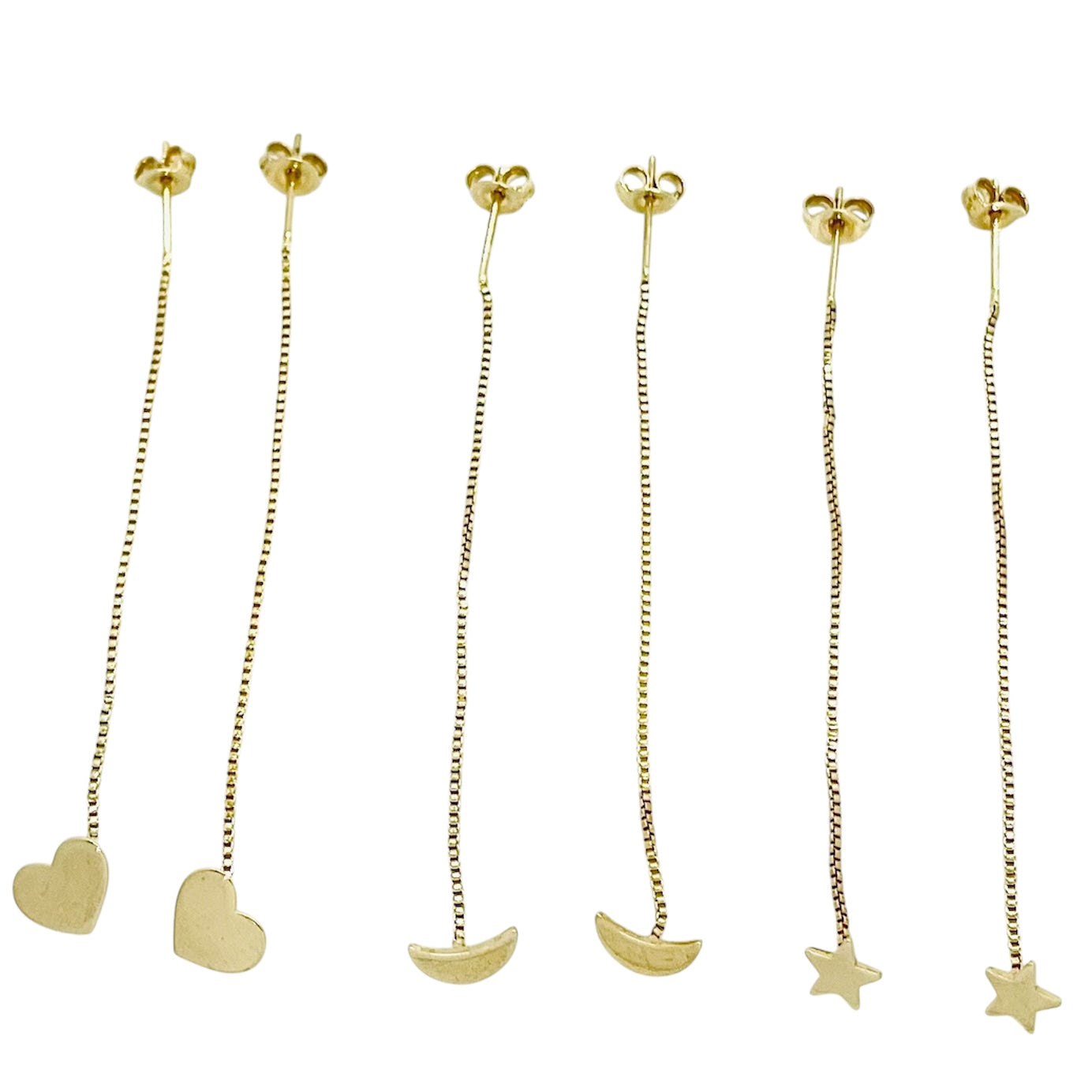 Estos aros son de diseño colgante en tono dorado, finos y delicados. Cada par presenta una cadena delgada con distintas figuras al final: corazones, lunas y estrellas. Su estilo minimalista y elegante los hace ideales para combinar con distintos looks, aportando un toque sutil y moderno. Perfectos para uso diario o para complementar un conjunto más sofisticado.